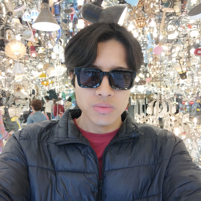 A male individual, appearing to be in his 20s or 30s, is positioned in a close-up, chest-up selfie. He has dark, medium-length hair with a middle part and wears black, square-framed sunglasses that obscure his eyes. His lips are slightly parted, indicating a neutral expression. He is wearing a dark, likely black, puffer jacket over a red t-shirt. The background is a highly reflective, seemingly mirrored environment densely filled with numerous illuminated light fixtures. These fixtures include various types of chandeliers (some with crystal elements), pendant lights, spotlights, and other lamps, creating an illusion of infinite reflections and a highly cluttered, bright space. Other indistinct individuals are visible as reflections within the background, suggesting a retail setting or showroom. The specialized nature of the environment, characterized by an extensive display of light fixtures and the use of reflective surfaces, strongly indicates a commercial establishment within the Santa Ifigênia neighborhood of São Paulo, Brazil, known for its specialized electronics and lighting stores. The individual is actively engaging in self-photography within this visually busy commercial interior.
