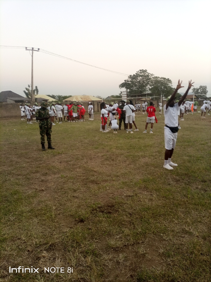 A wide shot captures a field setting with a group of people. Most are dressed in white shorts and shirts, while others wear red tops, and a person in camouflage stands apart. One individual in the foreground raises both hands in the air. A volleyball net is visible in the background, suggesting a sports activity. The sky is overcast, and utility poles are seen in the distance. A phone brand watermark is present at the bottom.
