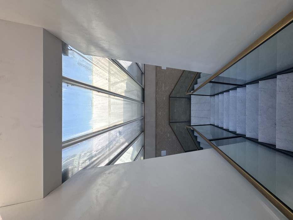 The image displays a downward view into a modern interior stairwell located within Christian VIII's Palace, part of the Amalienborg Museum complex in Copenhagen, Denmark. Overhead, a segmented glass skylight forms the ceiling, through which a clear blue sky is visible. A portion of the distinctive gray dome of Frederik's Church (Marmorkirken) is discernible through the upper-left panels of the skylight, which exhibit some surface dirt and streaking. The immediate side walls of the stairwell are smooth and light-colored. The staircase itself is constructed from light-grey marble or stone steps, descending straight towards a landing area where a light-brown brick wall is visible. Modern railings line both sides of the staircase, featuring clear glass panels topped with golden-hued metallic handrails. The entire scene is illuminated by natural light filtering through the skylight. No individuals, personal objects, or activities are present.