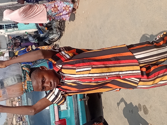 A man in a striped shirt and pants is standing next to a blue vehicle. He is carrying a large plastic bag on his head, secured by a patterned head wrap. People and a motorcycle are visible in the background, along with buildings. The scene appears to be outdoors on a sunny day. The man gazes directly at the camera.