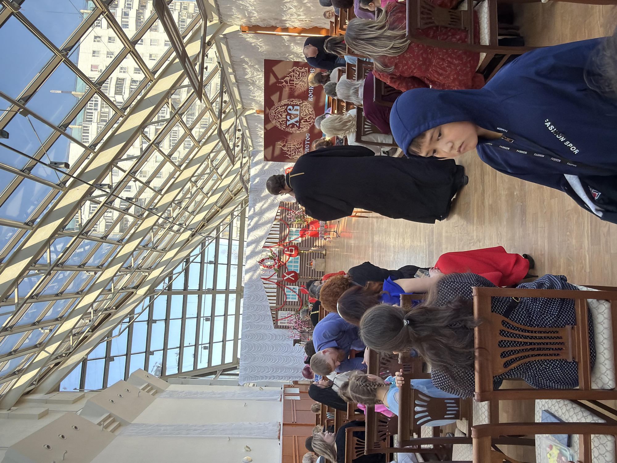 religious service taking place inside a building with a glass ceiling, located in Nizhnevartovsk, Russia. People are seated in rows of wooden chairs, with some kneeling or bowing their heads. A person in a black robe is standing at the front, likely leading the service. A large sign with religious symbols is visible in the background. A child in a blue hooded jacket is standing near the front of the room. The room appears to be well-lit due to the glass ceiling.