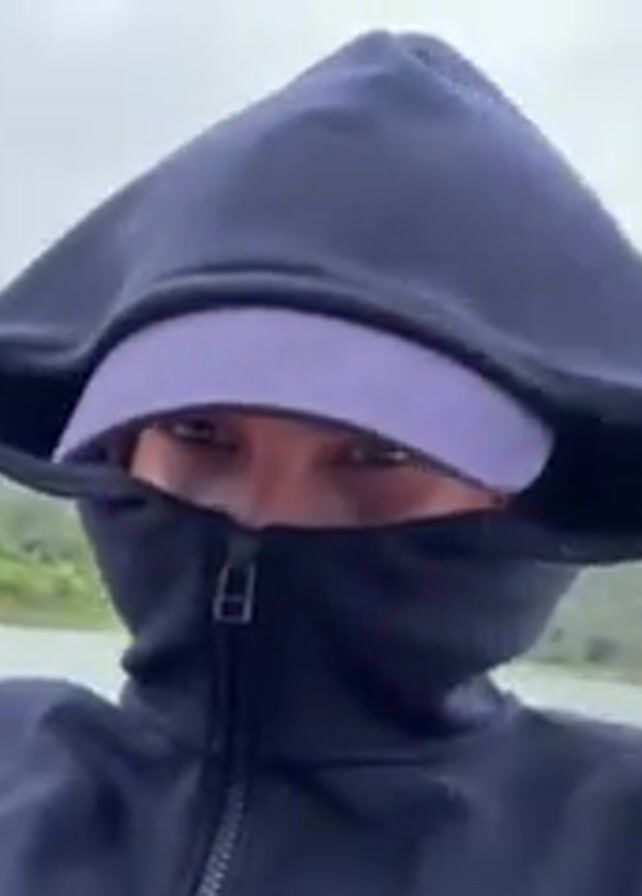 two women on a boat. One woman is wearing a dark blue hooded jacket and a purple baseball cap with a logo. She has the hood up and the jacket zipped up to cover part of her face. The other woman is next to her and is wearing a gray hooded jacket. They are on a lake or river, and the boat is moving quickly. There are trees and hills visible in the background. The sky is overcast.