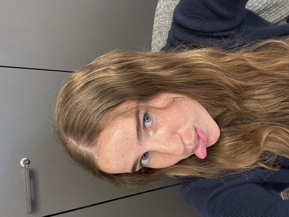 A close-up image depicts a young Caucasian female in an indoor setting, assumed to be in Bnei Brak, Israel. She has long, wavy light brown hair parted centrally, blue eyes, and numerous light brown freckles across her nose and cheeks. Her head is tilted slightly, and she is looking directly at the camera with her tongue extended from her mouth. She is wearing a dark blue knitted garment. The background consists of a dark grey, smooth surface, likely a metal filing cabinet or office panel, featuring a silver handle and a circular lock mechanism on the upper left. A vertical seam is visible in the background to the right of her head.