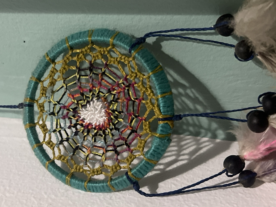 - "The image presents a multicolored dreamcatcher, approximately 15-20 cm in diameter, suspended against an interior wall" by FM-ypvmK2, licensed under CC BY 4.0