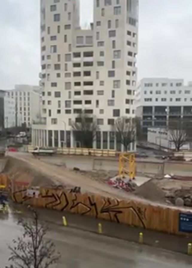 construction site on a wet, overcast day. In the background are several modern, white buildings. In the foreground, a street is visible. Between the street and the buildings is a fenced-off construction area with exposed dirt and construction equipment, including a yellow crane and excavators. A white truck is parked beside the fenced area. The fence is covered in graffiti. The camera pans up to show the height of a tall crane.
