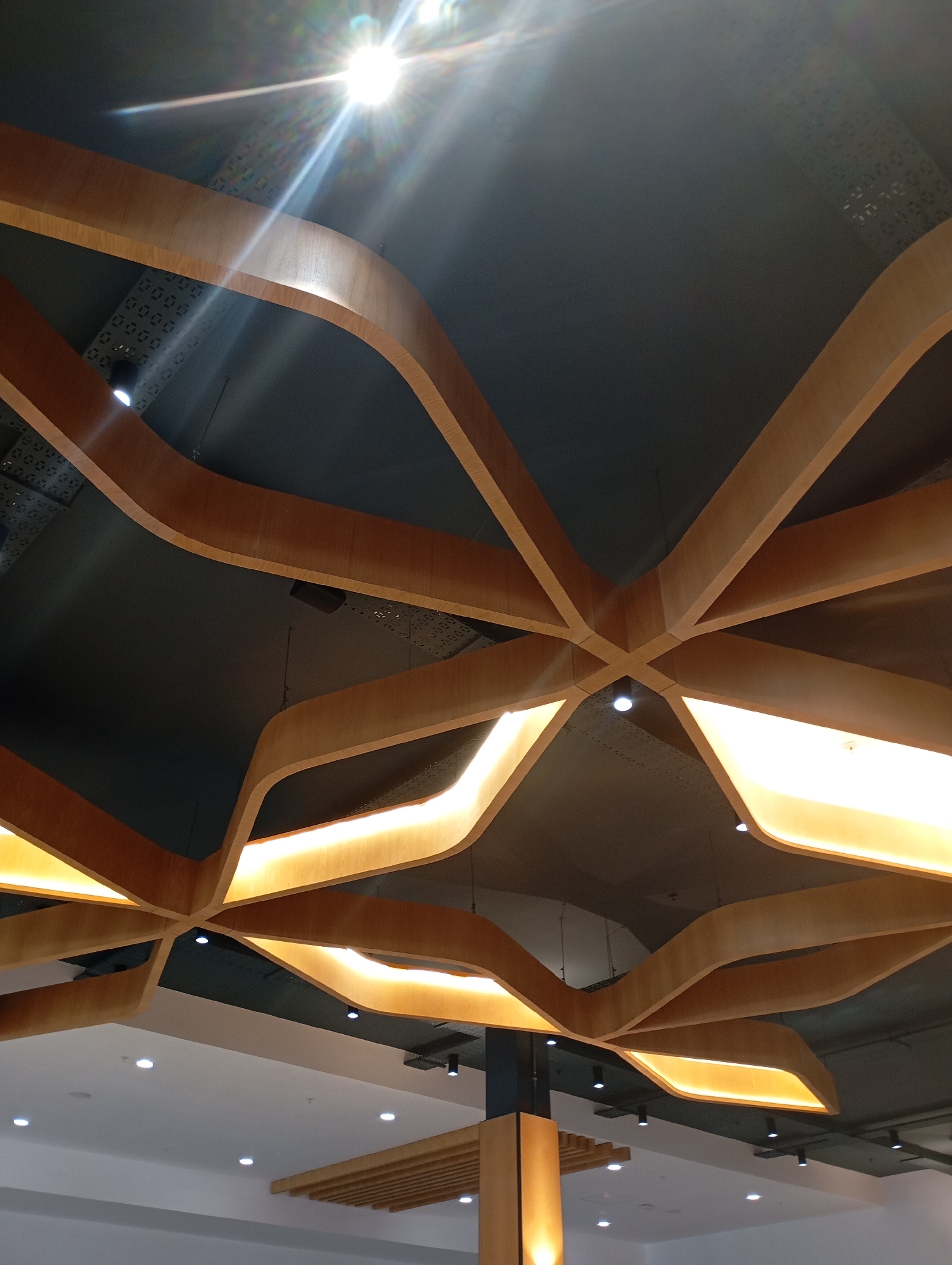 The image depicts an interior ceiling structure, likely in a public space, featuring a complex arrangement of curved, light-colored wooden beams against a dark gray ceiling