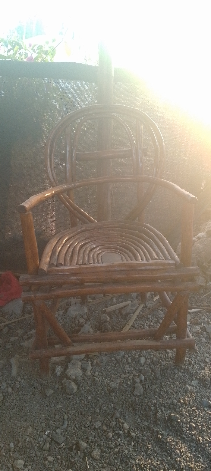 A single empty, handcrafted wooden chair stands outdoors in Matathani ward, Kenya