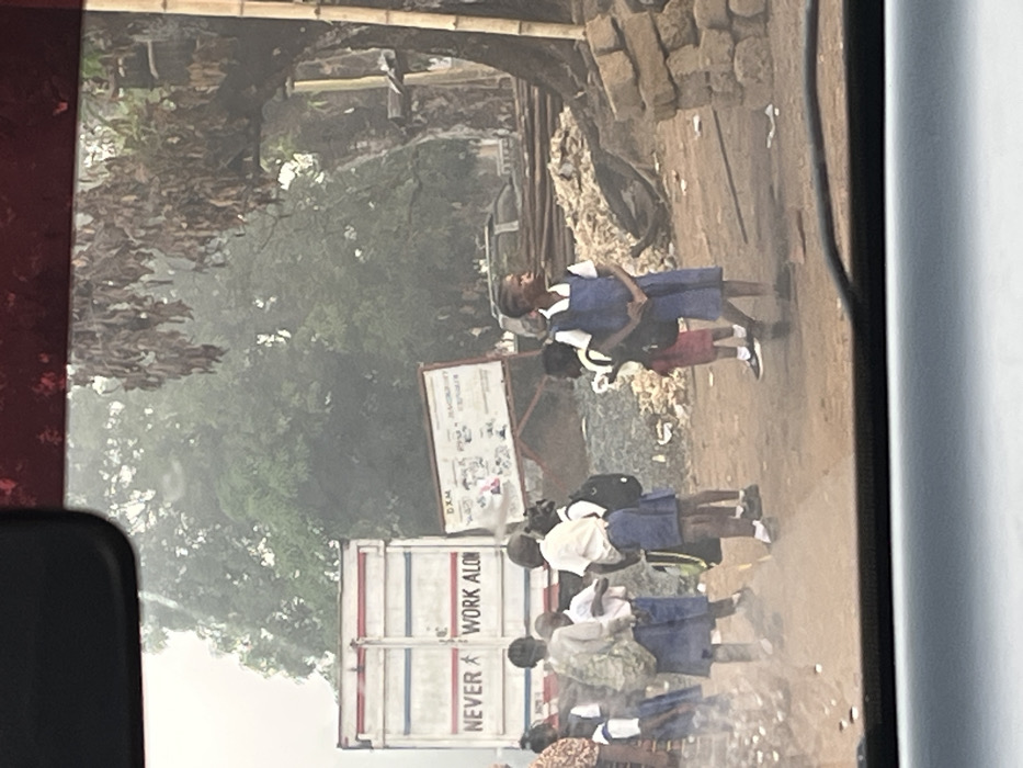 A group of school children wearing uniforms walk along a dusty road. Some are in blue dresses with white tops, while one wears red shorts. Behind them is a parked truck with the words "NEVER WORK ALONE" printed on its side. A sign with illustrations stands nearby, and a pile of rubble is visible in the background. Trees overhang the scene, adding to the atmosphere.