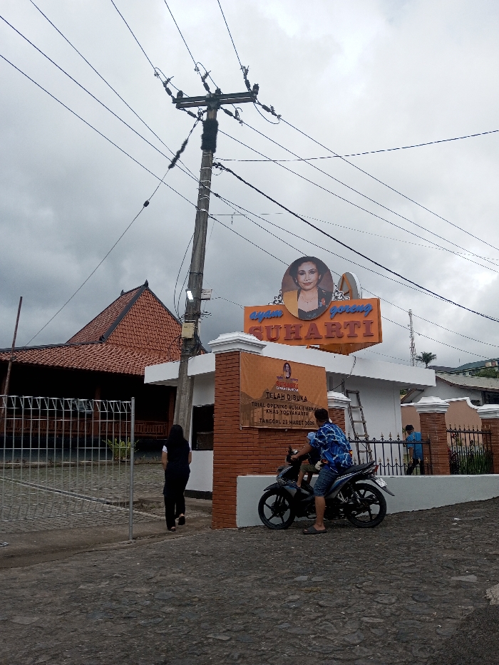 The scene is located in the city of Saing Ta Mawt Lay, Myanmar. An outdoor view under an overcast sky depicts a commercial establishment and street. A prominent orange sign above a white building entrance displays "Ayam Goreng SUHARTI" in blue text, accompanied by a circular portrait of a woman. Below this, an orange banner on a brick wall announces "TELAH DIBUKA TRIAL OPENING RUMAH MAKAN KHAS YOGYAKARTA TANGGAL 23 MARET 2026." To the left of the white building, a traditional-style building with a reddish-brown tiled roof is partially visible behind a grey metal gate. A tall wooden utility pole with multiple power lines stands prominently in the center. Three individuals are present. On the left, a person in dark clothing walks away from the camera, partially obscured by the partially open grey metal gate. In the mid-ground right, a male wearing a blue and white patterned shirt and blue shorts stands next to a black motorcycle, positioned as if dismounting or preparing to mount. On the far right, a third male, wearing a light blue shirt, is partially visible behind a brown metal fence, near a silver ladder leaning against the white building. The foreground consists of an uneven paved surface. The sky is largely covered by grey clouds.