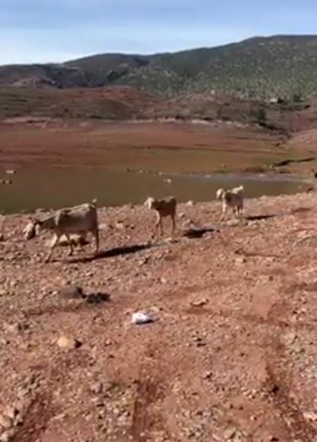 group of goats by the edge of a body of water. The goats are of varying shades of brown and white and move around grazing, some of them by the water's edge. The ground is rocky and reddish-brown. In the background, there is a hilly landscape with sparse vegetation under a blue sky.