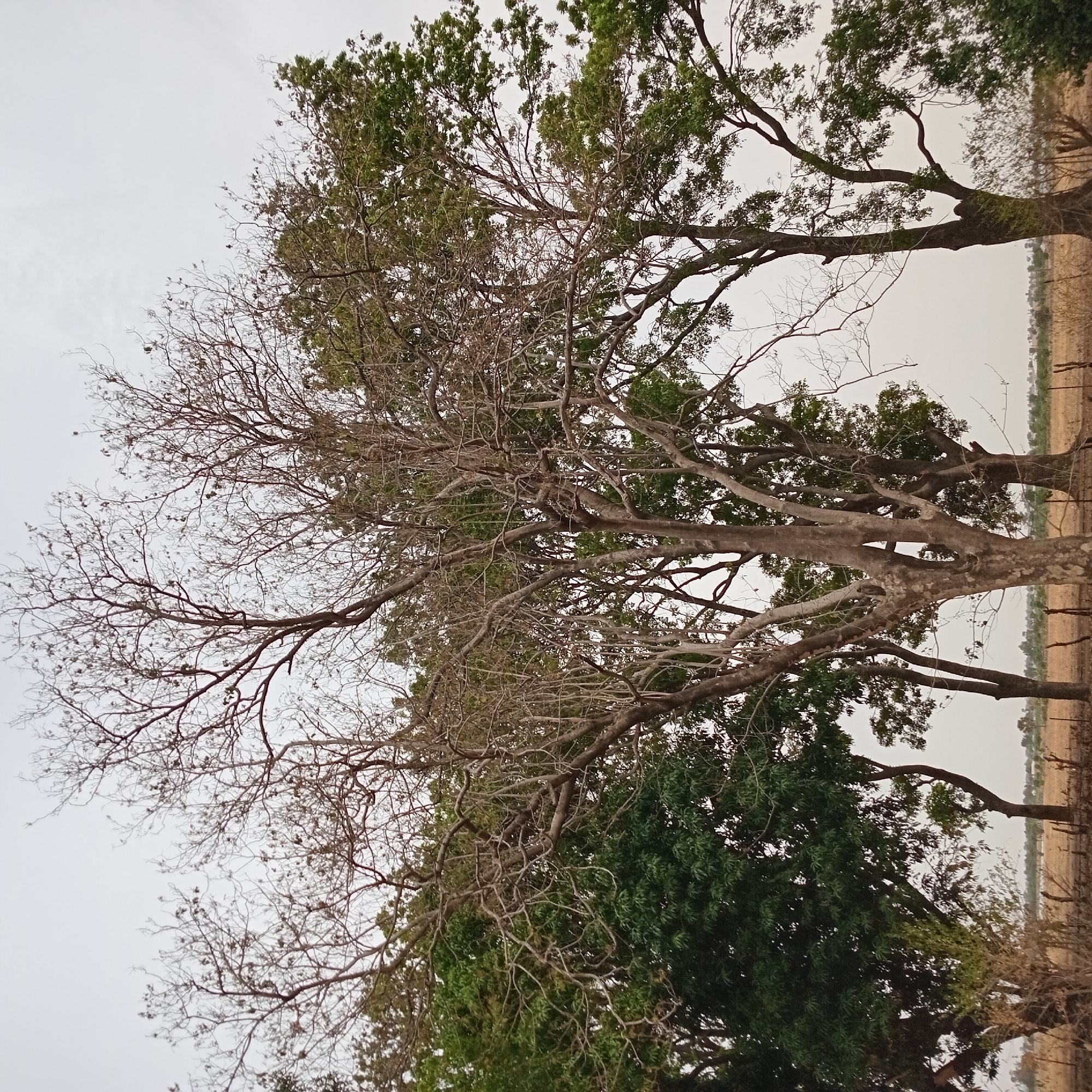 view looking up into several trees, some with green leaves and some bare branches. The background consists of a drab, overcast sky, and some distant, dry vegetation. The trees appear to be located in or near a rural or semi-rural area. There is no evidence in the photograph to confirm this is the city of Bomo, Nigeria. No people, actions or interactions are depicted.