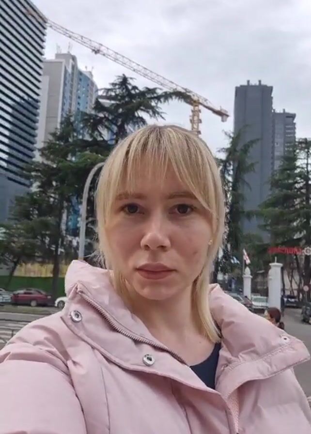 The video features a woman with blonde hair and bangs, wearing a light pink puffer jacket. She is standing outside on a city street. Behind her are tall buildings, including a modern skyscraper and a building under construction with a yellow crane. There are also trees and passing cars and pedestrians. At one point, a Wendy's fast food sign comes into view behind her. The sky is overcast.