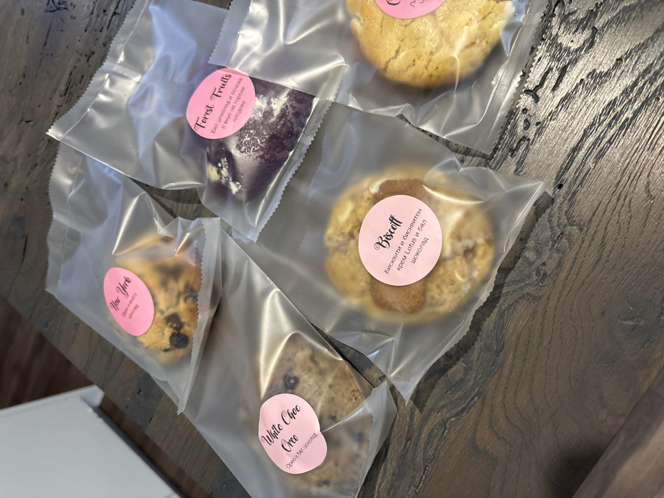 This image depicts six individually packaged baked goods, likely cookies or scones, arranged on a dark, textured wooden table. Each item is sealed in a clear, translucent plastic bag and features a round, pink label with product information in both English and Bulgarian. Visible labels identify flavors such as "New York," "White Choc Oreo," "Forest Fruits," and "Biscoff." The background shows a blurred, light-colored surface, possibly a wall or counter. The scene is located in Topolovo, Bulgaria. No people are visible, and no active interactions are occurring.