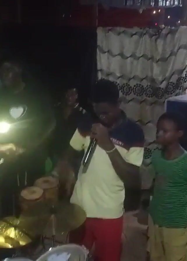 group of people appearing to perform or entertain at what seems to be an informal gathering. There is a man in a light-colored shirt and red pants holding a microphone and singing or rapping. He is facing the camera with energy. There is also a drummer visible, playing a drum set. The environment looks like a room, potentially an indoor/outdoor space, with curtains in the background, and other people are watching. The lighting is somewhat dim, with a few individuals holding flashlights. A child in a green and white striped shirt is standing near the singer.