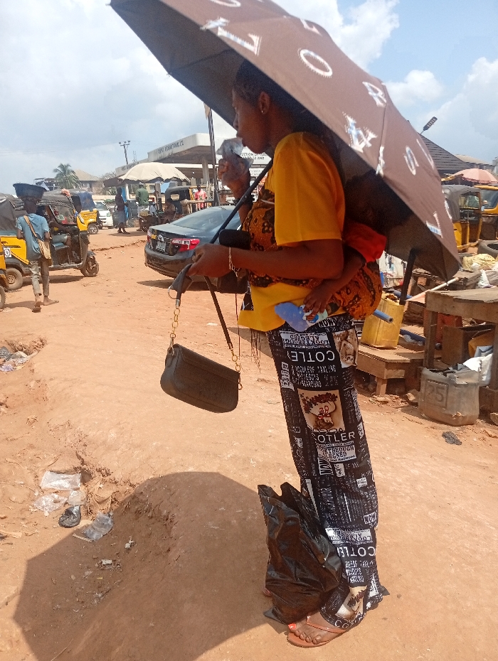 This image captures an outdoor street scene in Onitsha, Nigeria, under bright daylight with a partially clouded sky. The ground is unpaved reddish-brown dirt, littered with plastic bags and debris. The central subject is an adult female, seen in profile facing left. She wears a yellow short-sleeved top and black trousers patterned with white text. An open brown umbrella with lighter patterns provides shade over her and a small child strapped to her back. She holds the umbrella handle with her left hand, from which a black purse with a gold chain strap also hangs. Her right hand is raised to her mouth, holding a lit cigarette or similar item, from which smoke is visibly exhaling. A small child, wearing a red top, is secured to her back with patterned fabric; the child's right arm and head are visible, and its left hand holds a small blue and white object. The woman wears open-toed sandals. In the mid-ground to the left, a male figure wearing a blue shirt and shorts walks while carrying an object on his head, past several yellow and black motorized tricycles (Keke Napep). Further in the background, more tricycles and a dark-colored sedan are visible. A light-colored building in the distance features a sign partially visible, reading "SECTION 1" and "TERMINAL," suggesting a transport or market hub. To the right, obscured market stalls or structures are present, with items like yellow jerry cans and a grey plastic container.