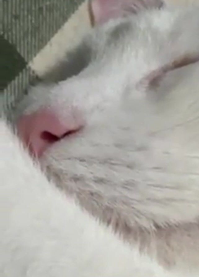 close-up of a sleeping cat. The cat is white with a pink nose. The cat is lying on a blanket with a green and white pattern. The cat appears to be relaxed and peaceful.