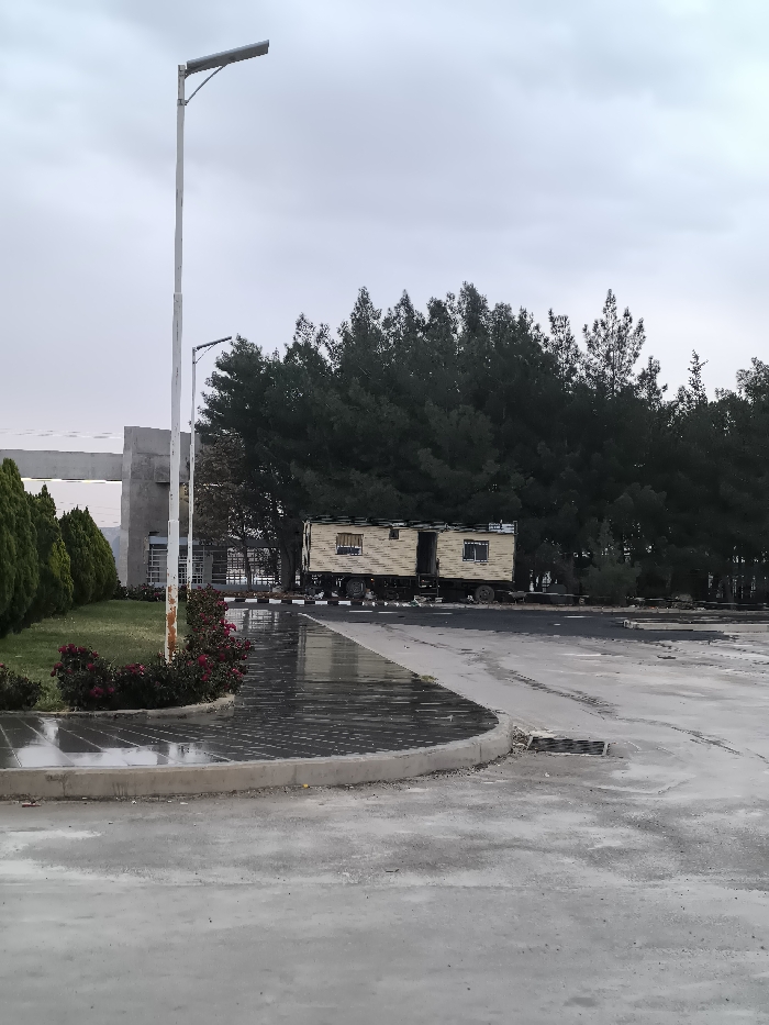 A tan trailer with windows sits on a parking lot beside a line of dark green trees. The ground is wet. To the left, a streetlamp stands tall near a building with green bushes and red flowers in front. The sky is overcast. The parking lot pavement has a dark and wet surface.