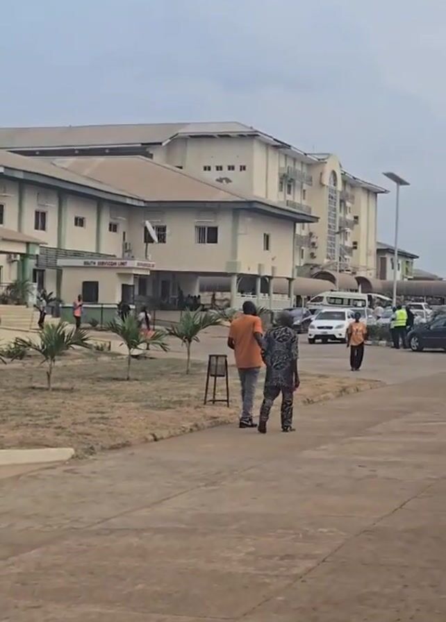 exterior of a large building complex with multiple wings, identified by a sign as the "South Iseyin Unit." The buildings are painted in shades of beige and green. In front of the building, there's a paved area, and beyond that, a patch of land with young palm trees. People are seen walking around in front of the building and in the parking area behind the complex. Cars and buses are parked in the lot. The sky is overcast, and the overall atmosphere is busy with people moving around the facility.