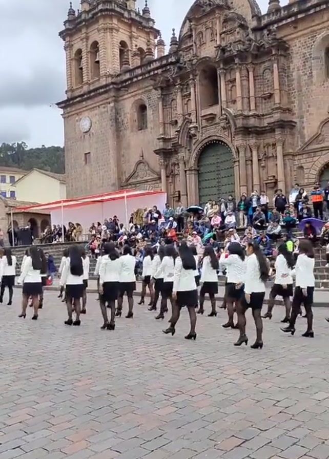 In a wide shot, a group of women march in formation across a cobblestone plaza. The women are dressed in matching outfits of white blazers, black skirts, black stockings, and black heeled shoes. They have long, dark hair. The women march in unison and are mostly facing away from the camera. Behind the marching women is a large stone church with multiple towers, a clock face, and an arched entranceway. Spectators of all ages line the steps in front of the church. Some spectators hold umbrellas to protect themselves from the overcast sky. There are also flags and barriers behind the crowd.