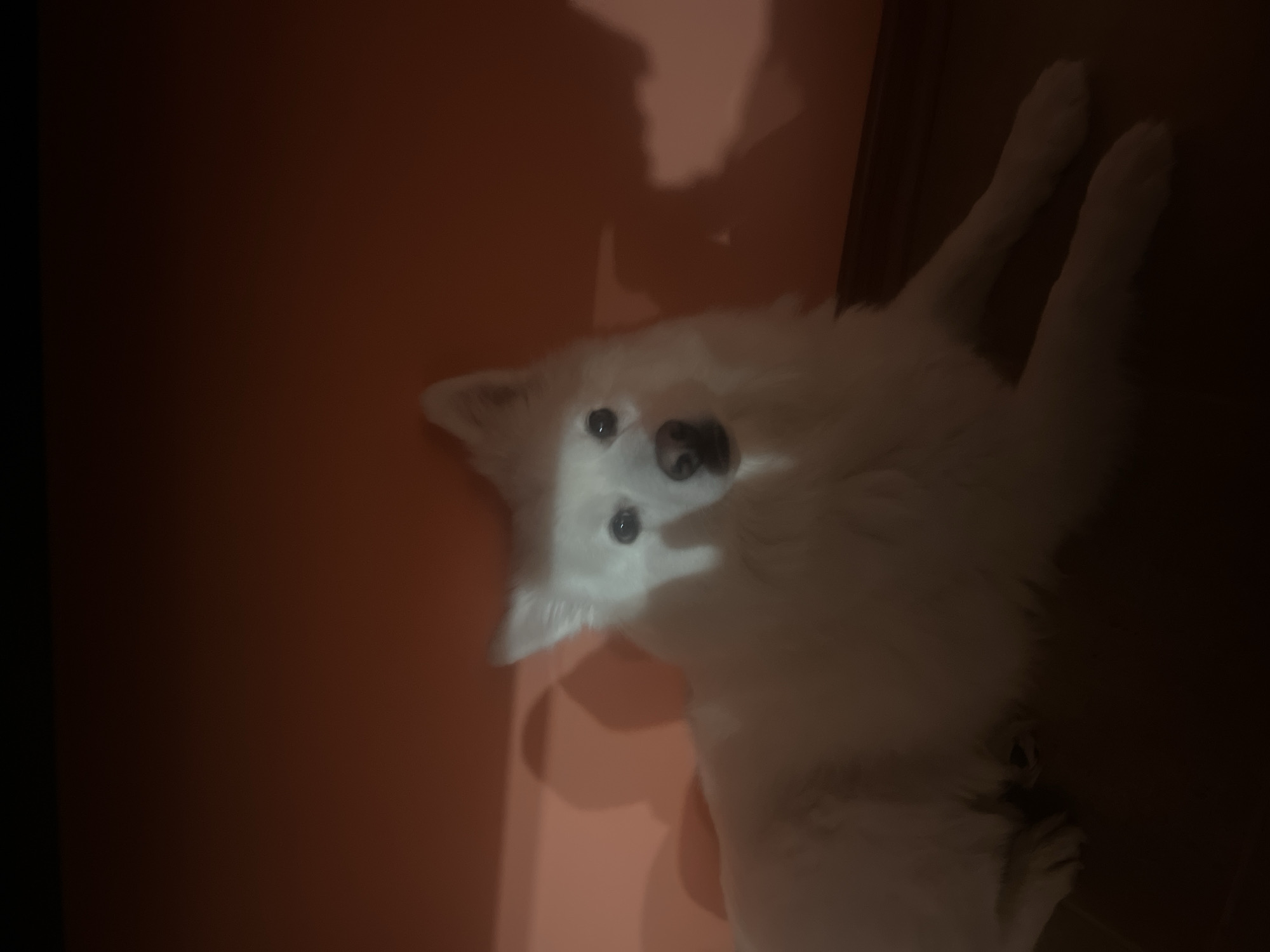 A white-furred dog, resembling a Samoyed or similar breed, is depicted lying on a dark floor indoors. The dog faces forward, its dark eyes and nose highlighted by a narrow, vertical beam of light across its face. Indistinct shadows are cast on the plain peach-colored wall behind the dog. A dark baseboard runs along the wall's lower edge. No human figures are present. The indoor environment lacks specific architectural details or landmarks to identify a precise location within Sofia, Bulgaria.