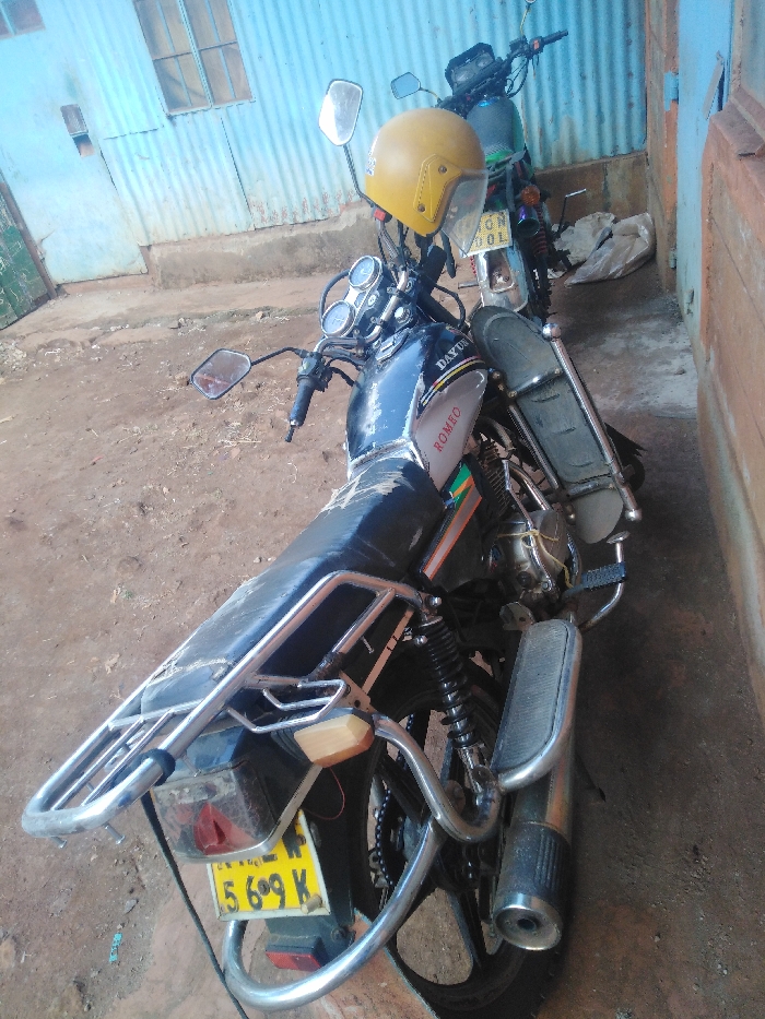 The scene depicts two motorcycles parked on a dirt ground next to a corrugated metal building wall, located in Olkeri ward, Kenya. In the foreground, a black and silver Dayun Romeo motorcycle, bearing a partially visible license plate "5 6G9 K", is parked facing left. A yellow full-face helmet rests on its handlebars. The motorcycle features a black seat, silver luggage rack at the rear, and chrome exhaust. Behind it and to the right, a second motorcycle, appearing dark green, is partially visible with a license plate fragment showing "KDN 00L". The background includes a light blue corrugated metal wall with a small, elevated window and a darker, possibly brick or concrete, wall on the right. A white plastic bag is visible on the ground behind the rear motorcycle. No individuals are present, and no actions or interactions are occurring; the motorcycles are stationary.