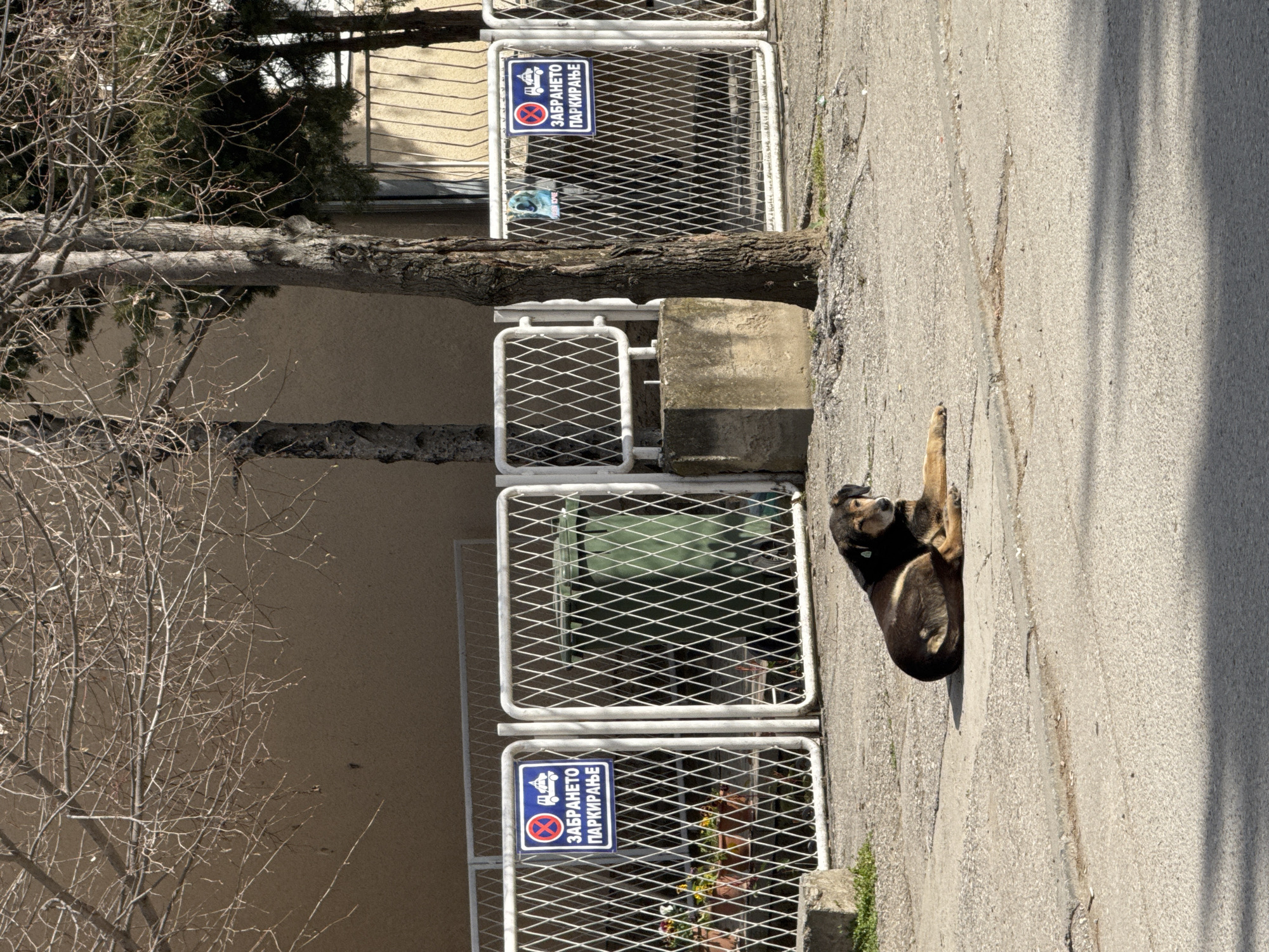 The image depicts an outdoor scene in Kumanovo, North Macedonia, under bright daylight conditions. A medium-sized, short-haired dog, predominantly black with tan markings on its face, chest, and legs, lies on a light gray concrete surface in the foreground. The dog is positioned with its body curled, its front paws extended forward, and its head turned slightly towards the viewer. A green identification tag is visible in its left ear. Behind the dog, a white metal fence with a diamond-patterned mesh runs horizontally across the midground, marking a property boundary. Two identical blue rectangular signs are affixed to the fence, each displaying a red circle with a diagonal line through a parking symbol (car and truck), accompanied by the Cyrillic text "ЗАБРАНЕТО ПАРКИРАЊЕ," which translates to "Forbidden Parking." Behind the fence, several potted plants with colorful flowers are visible to the left, while a tall green cylindrical garbage bin is partially visible to the right. A small poster depicting a light-colored dog is also attached to the right section of the fence. Bare-branched deciduous trees and some evergreen foliage are present behind the fence, partially obscuring a building with a light brown, textured facade. The sun illuminates the scene from the left, casting distinct shadows from the fence and a tree trunk onto the concrete ground. The concrete surface shows minor cracks and wear.