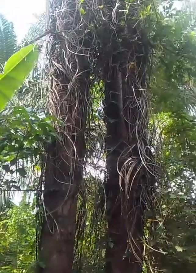 tall, thin tree in a lush, green environment. The tree has a dark trunk and is covered with vines, giving it a textured appearance. There are other trees and plants in the background, creating a dense, forest-like setting. A large banana leaf is visible on the left side of the frame. The sunlight is bright, creating a slightly overexposed effect. The text "Shot on AWESOME A50" is visible at the bottom of the frame. The person speaking identifies the tree as a "vine tree."