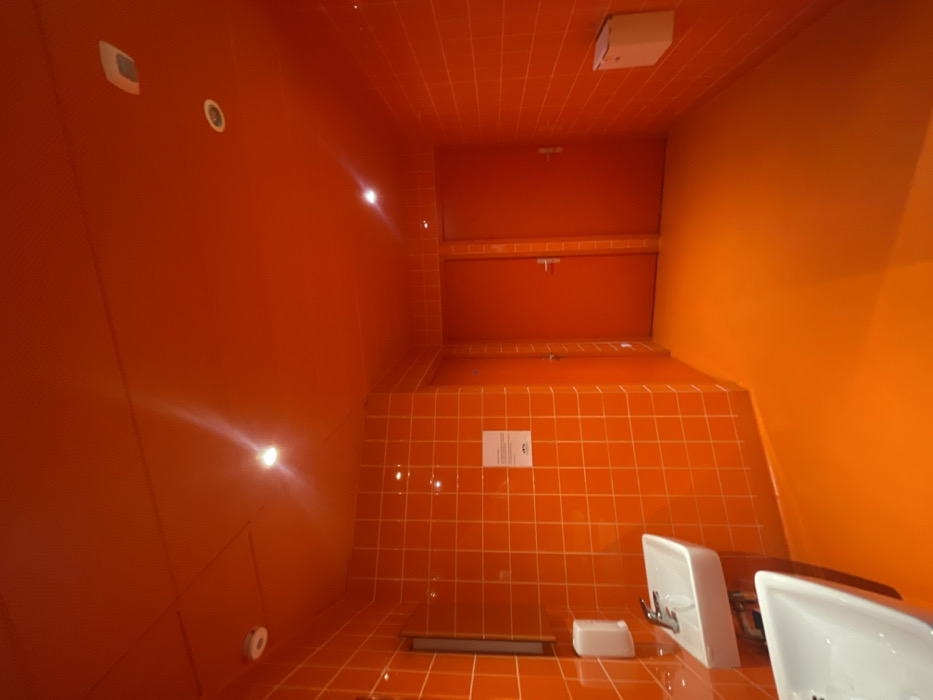 The scene depicts an interior space, likely a public restroom or changing area, located in Lyon, France. The environment is dominated by a monochrome color palette of orange and red. The walls are uniformly covered with square orange ceramic tiles, laid with light orange grout. The floor is a smooth, solid orange surface. The ceiling is painted a deep red, contrasting with the floor and walls, and features multiple recessed circular light fixtures emitting bright white light, along with a circular white fixture, potentially a smoke detector, positioned on the left side of the ceiling. On the left tiled wall, a vertical rectangular mirror is mounted above two white ceramic wash basins. Each basin is fitted with a chrome faucet. A white rectangular wall-mounted soap dispenser is located above the top basin. A white rectangular sign, bearing text predominantly in French, is affixed to the tiled wall on the left, near the center. Further into the room, two identical solid red doors are visible on the right side of the main corridor, each equipped with a horizontal chrome door handle and set within red doorframes. On the right-hand tiled wall, a white wall-mounted dispenser or receptacle is present. No individuals are observed within the depicted area.
