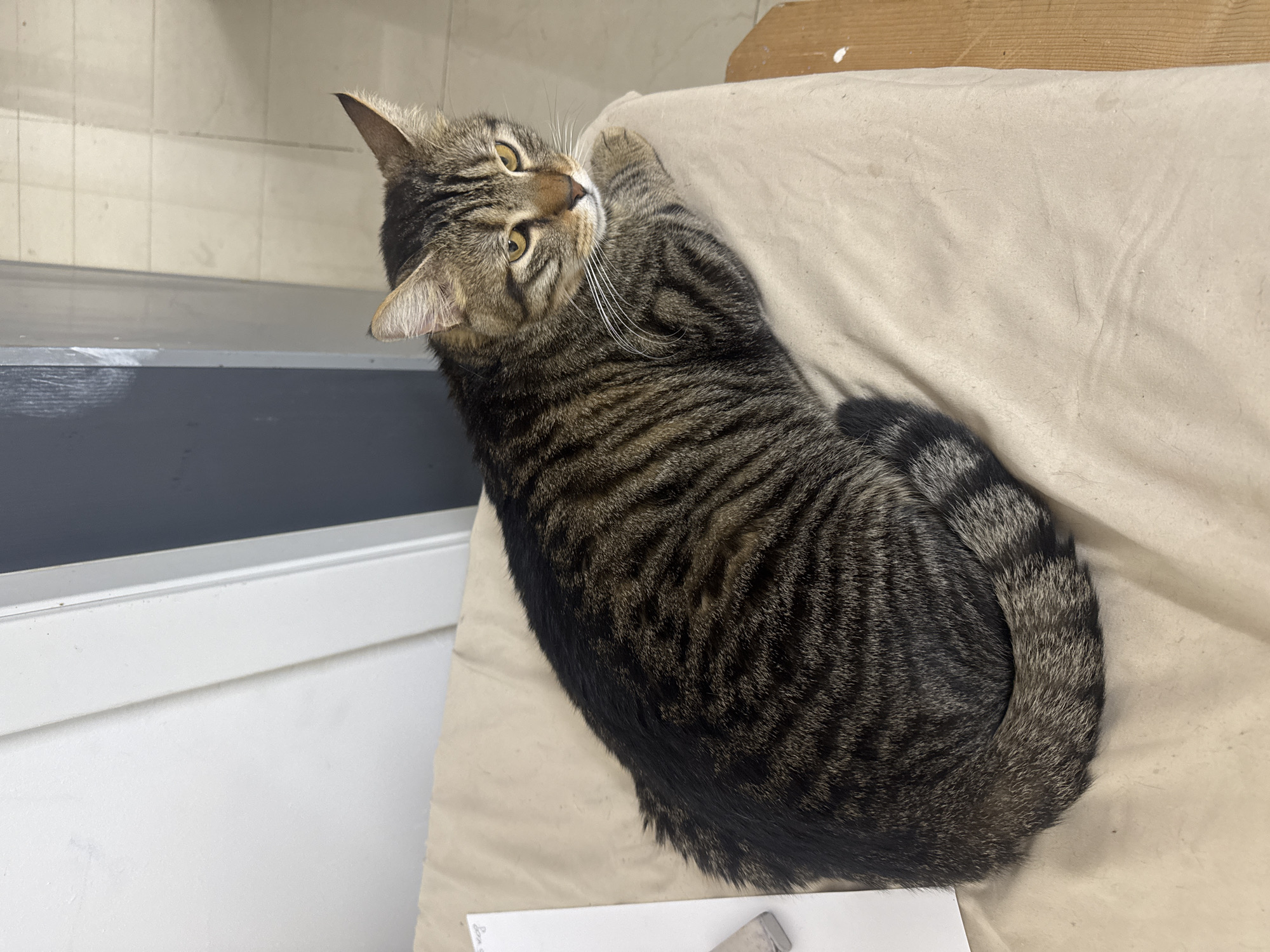 A brown tabby cat is lying on a beige surface, possibly a cushion or blanket