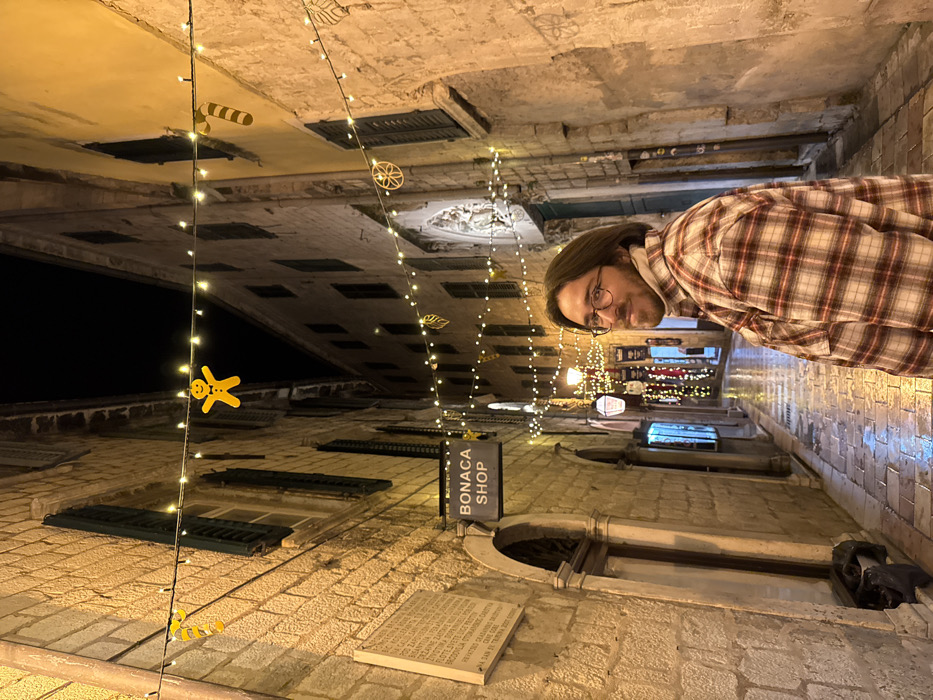 A narrow street scene with a man in a plaid shirt on the right side of the image. Strings of decorative lights hang between tall buildings. One building has a sign reading "BONACA SHOP". A plaque is mounted on the lower building, with text visible. Window shutters are dark and closed. The photograph is taken from a low angle, looking up the street.