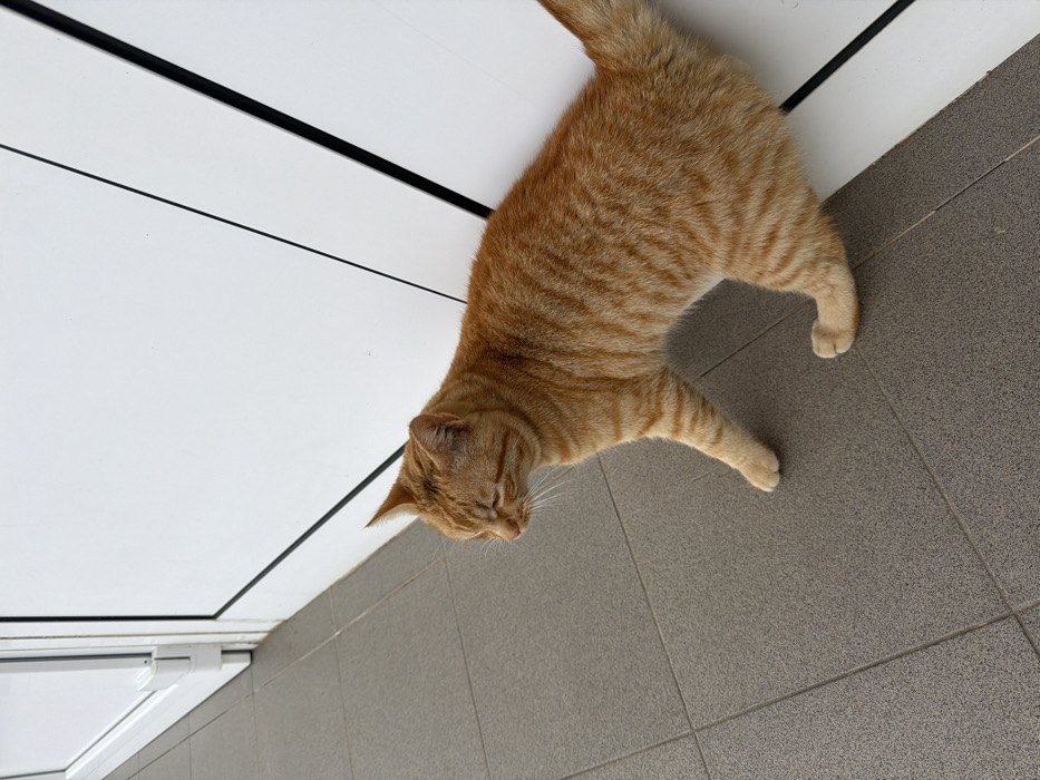 - "The scene depicts an adult orange tabby cat standing on a grey tiled floor, positioned along a white paneled wall with vertical black lines, in Unknown, Unknown" by FM-Be0I12, licensed under CC BY 4.0