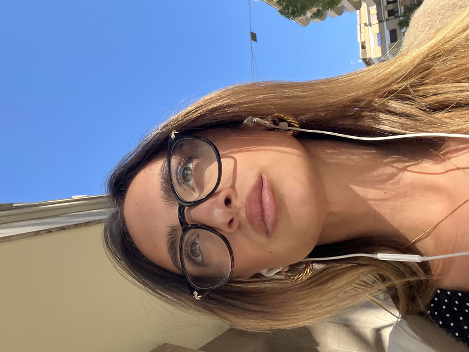 A female subject, appearing to be in her 20s or 30s, is depicted in a close-up, upward-angle shot, gazing skyward. Her long, light brown hair frames her face. She wears black-framed glasses with gold-toned insect or stylized embellishments on the temples. White wired in-ear headphones are inserted into both ears, with a "Beats" branded control unit visible on the cable. Large, textured, gold-toned hoop earrings are worn, along with a delicate gold chain necklace. Her visible attire includes a black and white polka dot garment under a light beige or brown cardigan. Strong direct sunlight illuminates her face, casting defined shadows, notably from her glasses onto her cheek. The background consists primarily of a clear, brilliant blue sky. In the upper left, a light-colored architectural overhang is visible. To the right, distant multi-story buildings with light facades and some green foliage are discernible, characteristic of residential areas within an urban environment. The scene is consistent with a sunny outdoor setting in the city of Rome, Italy, specifically in a residential district.