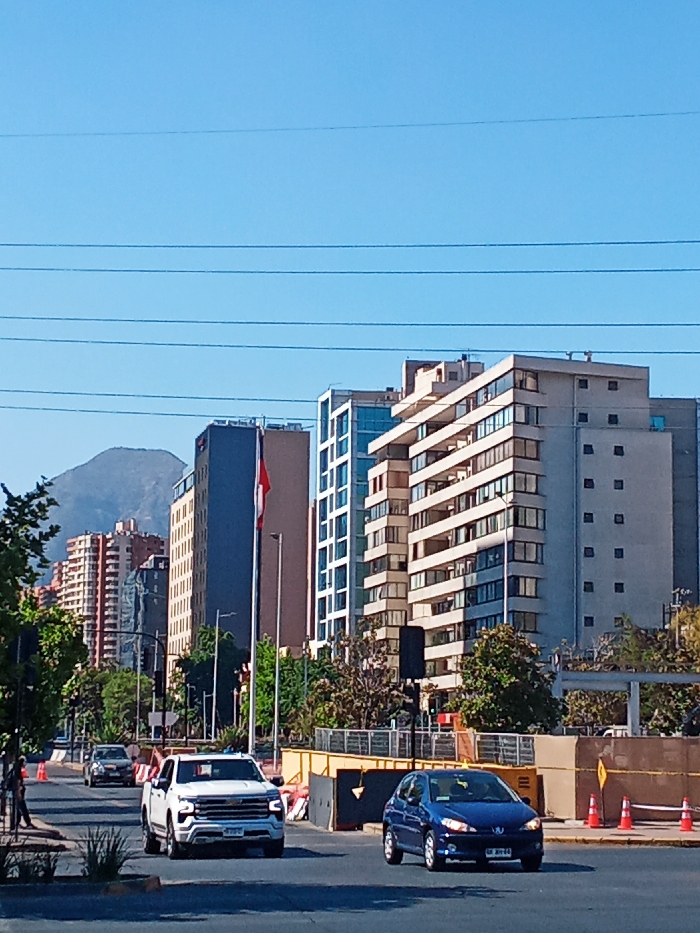 A cityscape with various buildings of different heights and architectural styles under a clear blue sky. A mountain is visible in the background. A road cuts through the scene with a white pickup truck and a blue car driving on it. Construction barriers line the roadside, and power lines stretch across the top of the image. Trees and greenery are scattered throughout the scene.