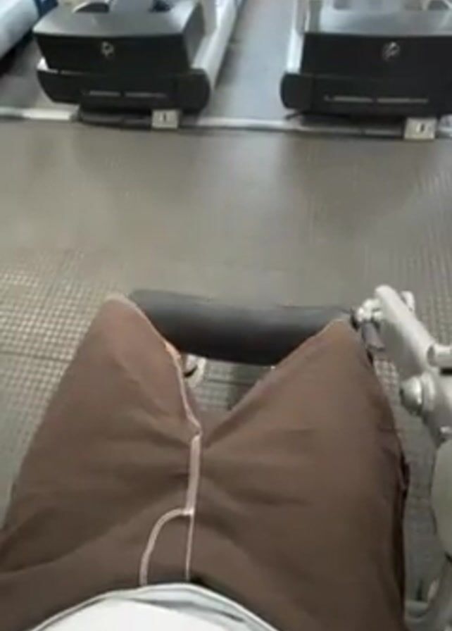 first-person view of a person sitting on a leg extension machine at a gym. The person is wearing brown shorts and white sneakers. Their legs are positioned under the padded bar of the leg extension machine. In the background, two treadmills can be seen, with one being used by another person walking on it. The gym floor is a dark grey checkered pattern. The leg extension machine appears to be made of metal.
