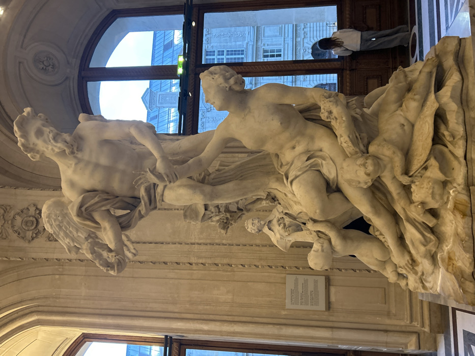 A marble sculpture dominates the frame, depicting a dynamic scene of intertwined figures