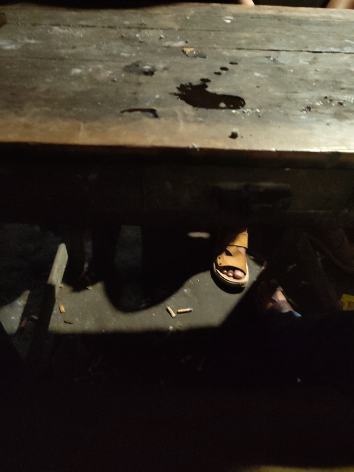 This image captures a low-light scene beneath and around a wooden table in Balla, Bangladesh. The upper portion of the frame displays a worn, dark wooden tabletop with multiple stains, including a prominent dark liquid spill resembling dried blood or oil towards the right, and numerous smaller splatters. Below the tabletop, the side of the wooden table structure is visible. The lower half of the image reveals a dark floor, likely concrete, illuminated by a localized light source from the upper left, casting strong shadows. On the floor, a person's bare foot, wearing a light brown open-toed sandal, is visible towards the right. Another darker, less distinct foot or leg is partially discernible further to the left, primarily within shadow. Several discarded cigarette butts are scattered on the floor directly beneath the table. No direct interactions or actions are discernible other than the presence of individuals' feet under the table. The environment appears utilitarian and somewhat disheveled.