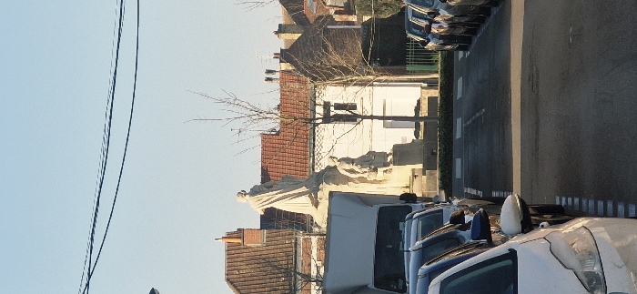 An outdoor urban scene in Lens, France, depicts a street with parked vehicles flanking a central monument under a clear blue sky. The prominent subject is a light-colored stone monument, identified as likely the Monument aux Mineurs et aux Familles (Miners and Families Monument), situated at Place du Général de Gaulle. The monument features two primary human figures: a larger, robed figure standing on an elevated pedestal, facing away from the viewer, and a smaller figure, possibly female, seated or kneeling on a lower section, holding an object. In the foreground, rows of parked vehicles line both sides of the asphalt road. On the left, a white hatchback is partially visible, followed by a white panel van, obscuring the base of the monument. White parking space markings are visible on the road surface. On the right, a line of dark-colored cars is parked parallel to the street. A zebra crossing is marked on the asphalt in the mid-ground. The background consists of several residential or commercial buildings characterized by reddish-brown tiled roofs, brick facades, and visible chimneys. A bare-branched deciduous tree stands behind the monument. Overhead, multiple dark utility lines stretch horizontally across the upper portion of the frame against the sky. The scene is illuminated by natural light, casting shadows consistent with a low sun angle from the right. No active human figures are visible.