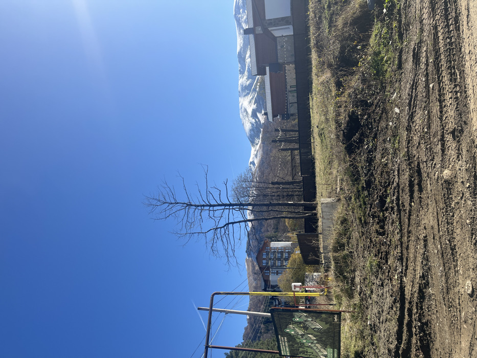 The image captures an outdoor landscape in Bakuriani, Georgia, under a clear, bright blue sky with a visible sun glare in the upper right quadrant. The foreground consists of uneven, muddy brown earth with distinct tire tracks and sparse green vegetation. To the left, a large, dark green sign displaying a map or diagram with white text is present, supported by a reddish-brown metal framework. Behind this sign, a yellow and black utility box and several utility poles with cables are visible. Centrally, two tall, bare deciduous trees with an intricate network of branches stand. Behind the foreground and extending horizontally across the midground is a dark brown fence or retaining wall. Beyond the fence, a patch of dry grass and smaller, bare trees are seen. To the mid-left, a multi-story building with a light-colored facade, brown wooden accents, and multiple windows/balconies is situated. To the mid-right, several modern chalet-style buildings with dark roofs, stone bases, and wooden siding are visible. String lights are strung between posts in the open area in front of these structures. The background features a range of rolling mountains and hills. The upper elevations of these mountains are covered in white snow, while the lower slopes are characterized by brown and green vegetation. No people, animals, or explicit actions are depicted in the scene. A faint white contrail is visible in the upper-left portion of the sky.