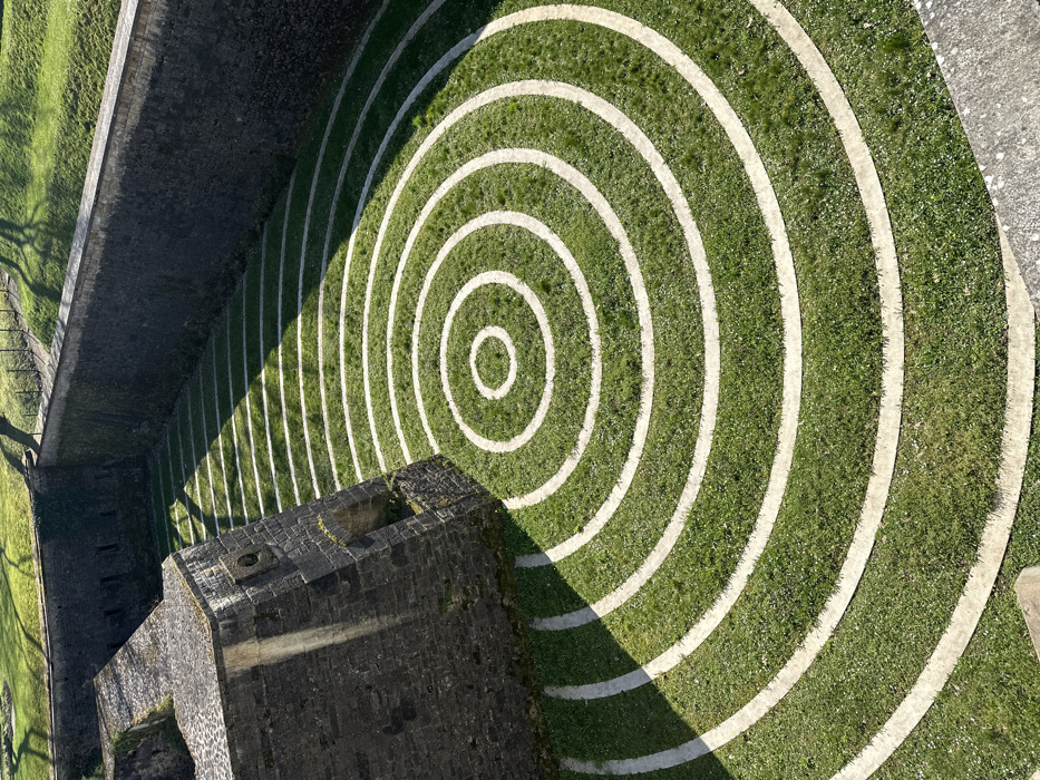 The scene shows an elevated view into a fortified depression within the Pétrusse Valley, Luxembourg City, Luxembourg. To the left, a substantial multi-faceted bastion constructed of dark grey stone blocks features several recessed openings, casting a prominent shadow across the lower left area. The base of the depression consists of vibrant green grass, intricately patterned with a series of concentric circles and arcs formed by wide, light-colored bands, identifying it as the "Jardin des Cercles." These circular patterns are fully formed in the central, sunlit portion and appear as partial arcs extending towards the shadowed areas. To the right, a tall, dark stone retaining wall with a lighter coping borders the depression, beyond which a grassy embankment with sparse trees and fencing is visible. Strong sunlight illuminates the environment, creating distinct shadows. No individuals are present.