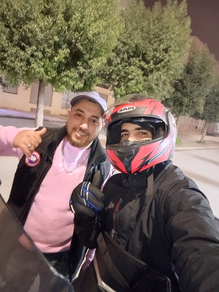Two men pose outdoors at night. The man on the left wears a blue cap, light pink sweater, and black vest, giving a thumbs-up. He has a silver chain necklace. The man on the right wears a red and black motorcycle helmet and black gloves, also giving a thumbs-up. Both wear black jackets. Background includes trees, streetlights, and a building. The scene is illuminated by artificial lighting.