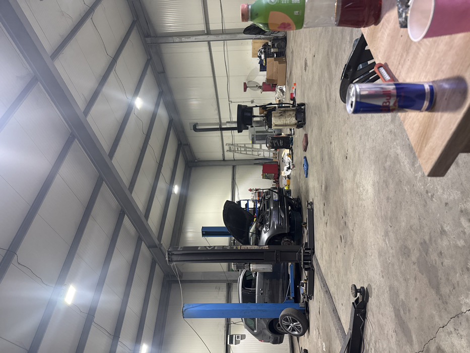 This image depicts the interior of an automotive repair garage in Pazardzhik, Bulgaria