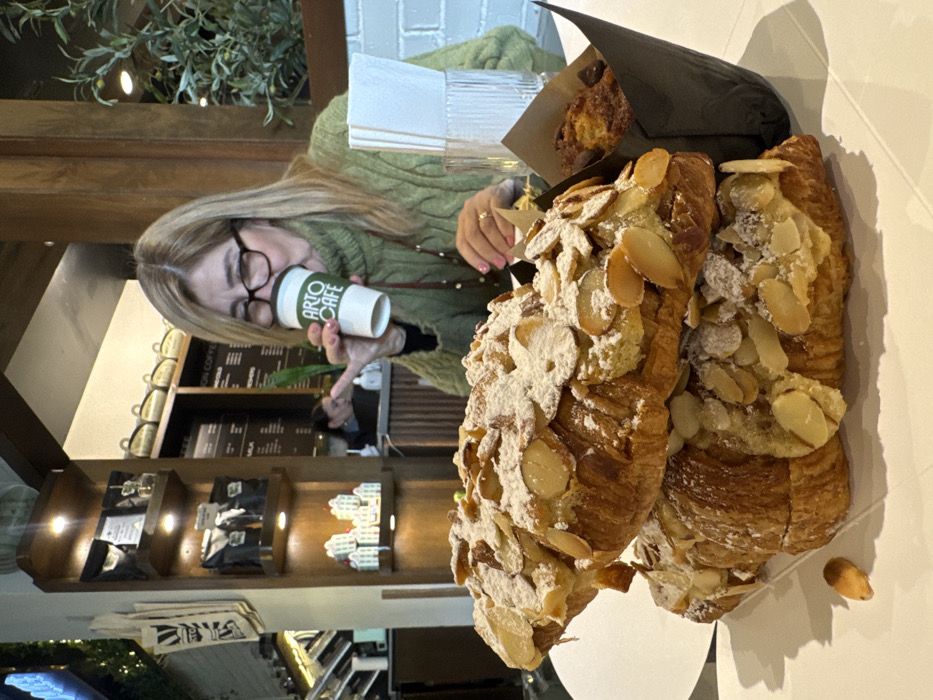 A woman in a green sweater and glasses drinks from a "ARTO CAFE" cup. Two almond croissants dusted with powdered sugar dominate the scene, along with a brown baked good in a dark paper bag. Shelves displaying coffee products are in the background.