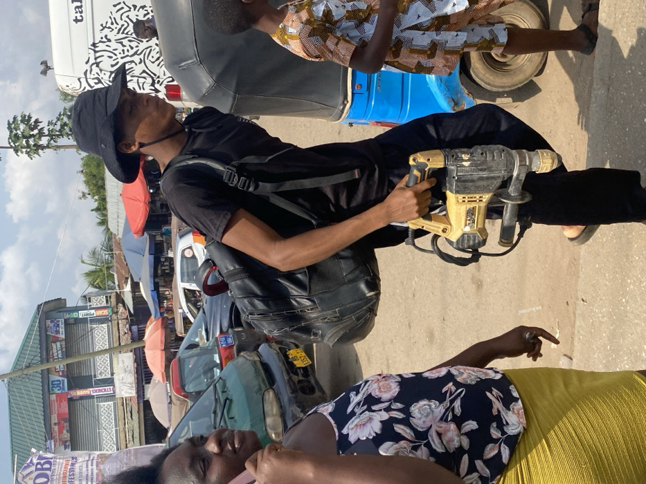 The image depicts a busy street scene in Ablekuma, Ghana, under a partially cloudy sky. In the foreground, a dark-skinned woman with short dark hair is positioned on the left, holding a pink smartphone to her right ear, indicative of a call. She wears a dark blue floral sleeveless top and a bright yellow pleated skirt, with a ring on her left ring finger. To her right, a dark-skinned man walks towards the right side of the frame. He wears a black bucket hat, a black short-sleeved t-shirt, dark trousers, and dark sandals. A black backpack is slung over his left shoulder. In his right hand, he carries a yellow and black rotary hammer power tool with a visible cord and an auxiliary handle. Partially visible on the far right is a child wearing a patterned shirt with geometric brown and white designs and dark sandals, walking near a light blue auto-rickshaw. In the mid-ground and background, multiple vehicles are present, including a green Hyundai van with Ghana license plate GR 1357-17, a red and white auto-rickshaw, and other cars. A two-story building with a green corrugated metal roof stands in the background, featuring multiple storefronts with roll-down metal shutters and advertising posters, including "OBI ROOFING LTD" and "SCSAN SPORTS." Several market stalls with colorful umbrellas (red, blue, dark blue) are also visible, suggesting a commercial area. The ground surface is an unpaved or dirt road. A tall, slender tree is visible behind the buildings.
