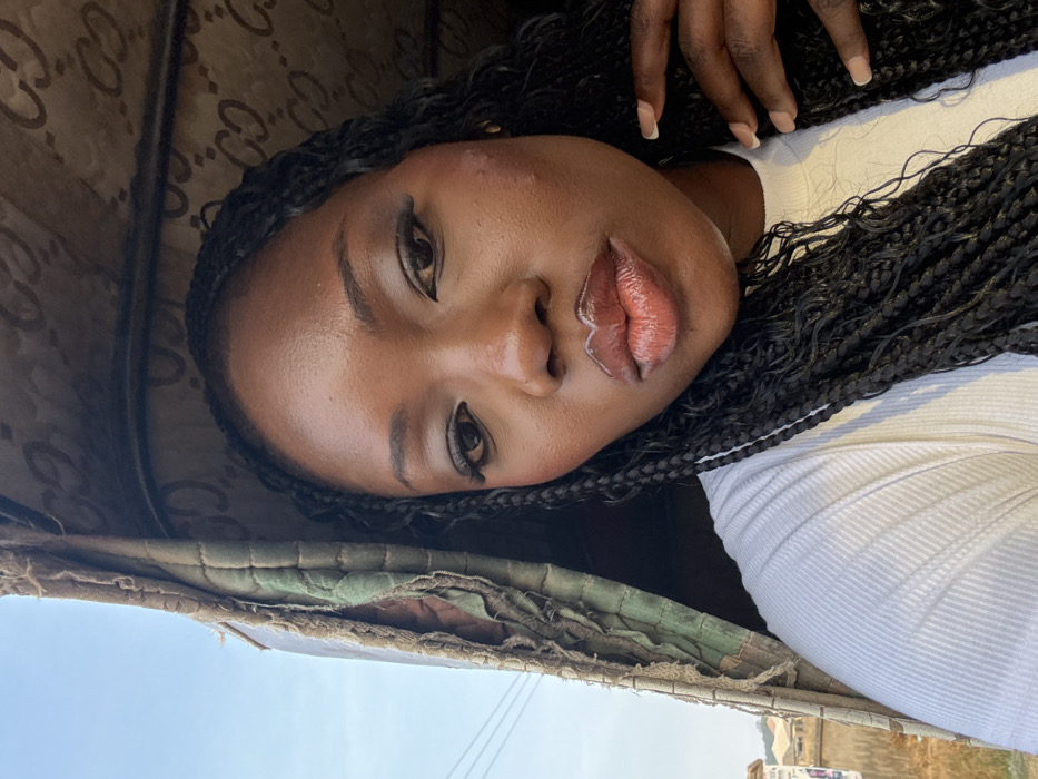 The image depicts a female individual in a close-up, chest-up shot, positioned inside what appears to be a commercial tricycle (keke napep). She has dark skin, long dark braided hair, and is wearing a white ribbed top. Her face is made up with defined eyebrows, eyeliner, blush, and a clear lip gloss accented by a distinct white outline. Minor skin blemishes are visible on her right cheek. Her left hand, with manicured fingernails, is partially visible near her left shoulder. Above her head, the vehicle's interior canopy is visible. It is a quilted, worn fabric with a repeated pattern resembling the "GG" logo associated with Gucci. The canopy material appears aged and slightly frayed along the frame on the left side. Outside the vehicle, visible through the open side, is a clear blue sky, distant low-rise structures, and utility lines, suggesting an urban or semi-urban environment. The lighting indicates daytime. The scene is consistent with an urban setting within Abuja, Nigeria, commonly served by such tricycle transportation.