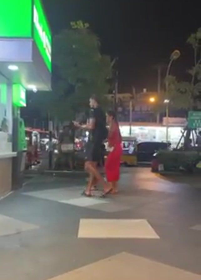 At night, a group of four young people stand on a sidewalk. The first person is wearing a white top and purple shorts. The second person is wearing a red dress, the third person is wearing a black top and black shorts, and the fourth person is partially visible and wearing a grey top and grey shorts. They all seem to be looking up and gesturing as if pointing or reaching for something. Behind them is a street at night with various shops and cars. The setting seems to be a busy tourist area.