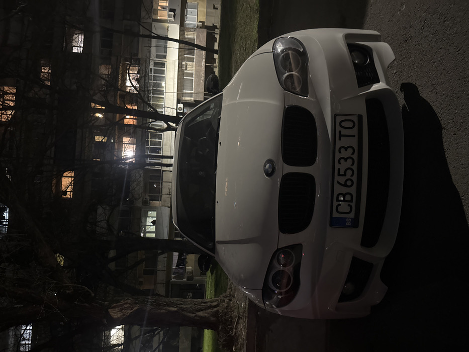 A white BMW car is parked outdoors at night in a residential area of Vidin, Bulgaria