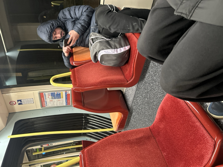 - "In the photograph, a person wearing a puffy hooded jacket is reclining across two red public transportation seats, appearing to be using a mobile phone" by FM-joMVs2, licensed under CC BY 4.0