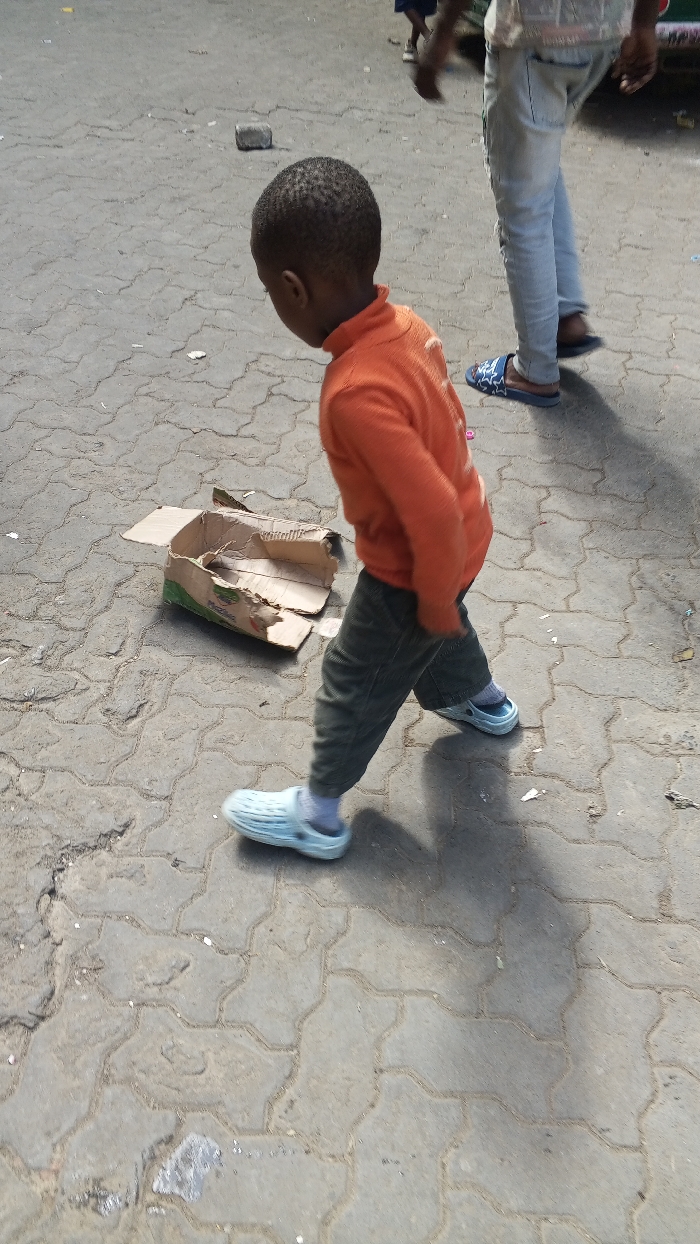 An outdoor scene in Nairobi, Kenya, captures a young Black child and a partially visible adult male walking on a grey interlocking concrete block pavement under bright sunlight. The child, observed from the upper back and right side, wears an orange long-sleeved shirt, dark trousers, light blue socks, and light blue Crocs-style shoes. The child is moving towards the left side of the frame, with the head slightly angled down and to the left. A flattened, torn cardboard box lies on the pavement to the left and slightly behind the child. In the upper right background, an adult male's legs and lower torso are visible, clad in light-wash blue jeans and blue slide sandals; this individual is also moving towards the left. The worn pavement shows minor cracks, dirt, and scattered debris including a small grey stone. Clear shadows of both individuals are cast on the ground, indicating direct sunlight.