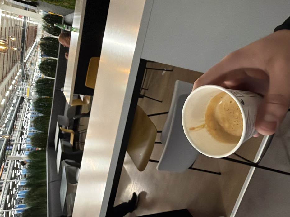 The image displays an indoor cafeteria or break area situated within a large commercial or industrial facility in Sevenum, Netherlands. In the immediate foreground, a hand holds a white paper cup containing a light brown beverage with visible crema, consistent with espresso or coffee. A long, white counter with a dark underside traverses the midground, creating a barrier. Below this counter, a yellow-orange stool-style chair is positioned, with a light grey chair visible further back. To the far left, the lower legs and black-shod feet of an individual are partially visible. Beyond the counter, a seating area is arranged with dark grey upholstered booth benches forming an L-shape. These are paired with multiple tables, some dark grey and rectangular, others lighter in color. Various individual chairs, including yellow-orange and dark grey models, are placed around the tables. Behind the booth seating, a continuous row of dense green foliage acts as a divider. An older male individual with a bald head is observed reclining or sitting in the booth on the right, partially obscured by a table where a green glass bottle of water stands upright. A blurry figure is also visible standing near the foliage in the distant background. The far background reveals a vast, brightly lit interior space, indicative of a warehouse or production environment. This area features extensive rows of shelving units receding into the distance, and an overhead infrastructure composed of pipes, ducts, and industrial light fixtures against a high ceiling.