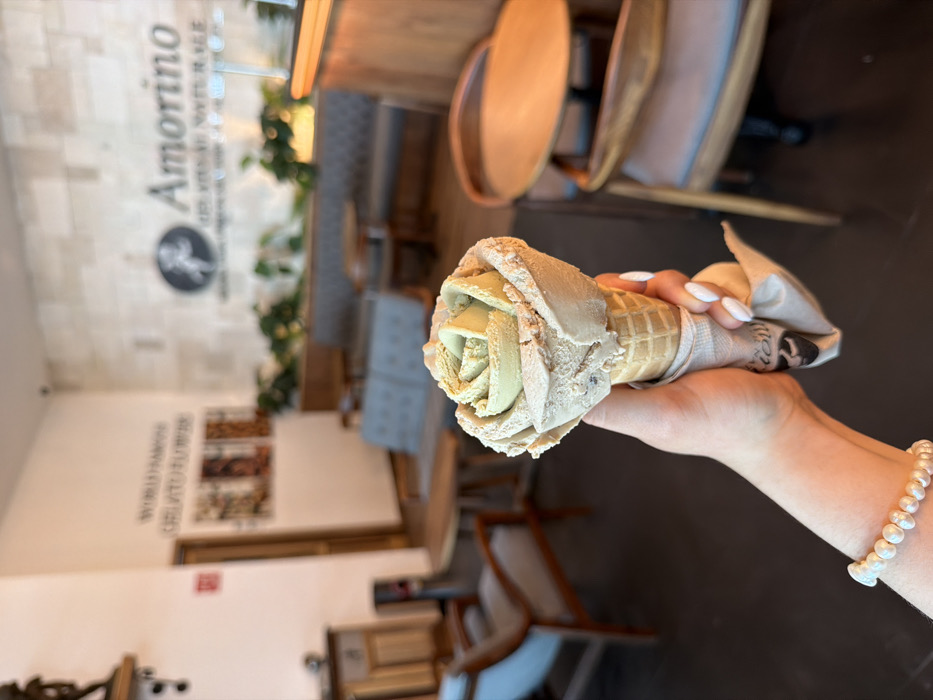 - "A first-person perspective photograph captures a human left hand holding a rose-shaped ice cream cone inside an Amorino gelato shop located in Veracruz, Mexico" by FM-FhsqR2, licensed under CC BY 4.0